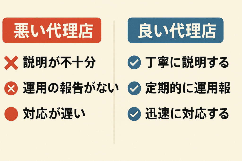 見極めポイント | 悪い代理店のサイン | 良い代理店の特徴 |