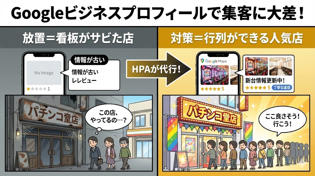 リアルな店舗で例えてみてください。 いくら店内が新台で盛り上がっていても、入り口の看板が錆びついていたり、照明が消えて真っ暗だったりしたら、お客様は入ってきませんよね? Googleビジネスプロフィールを放置するのは、それと同じことをWEB上でやっているのと同じなのです。